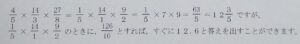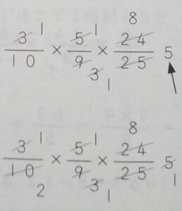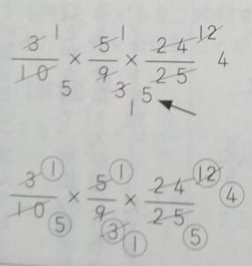 分数のかけ算で約分をしているとき,分母が2×5になったら,それ以上約分しないほうが楽です。ワードで打ち込んだ分数がうまく表示されないので画像にしましたが、ちょっと見にくいかもしれません。