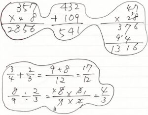 筆算を消したがる子もいますが、筆算は消さないで残しておきましょう。自分のミスがどこで発生したか確認するためです。いちいち消している時間は無駄です。計算用紙を用意しておくのもよい方法ですが、書き方を工夫しないと無駄が多くなります。紙の左上からきちんと書き、たまってきたらそれまでの計算を線で囲むと余白がはっきりして、次の計算が書き込みやすくなります。