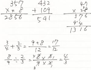 筆算をきれいに書けないとミスを多発します。筆算はきたないものだと思っているようで、ノートやプリントの隅に小さくこちょこちょと筆算を書く子が多いです。そしてよく間違えます。小さい字で斜めに書いて、縦や横がどうなっているのか分かりにくいからです。成績優秀者は、筆算を大きい字ではっきり書きます。