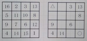 この問題では,まず1から16までの和を4等分して1列の和を34と求めておきます。右下の○印の部分に注目すると,たての和は13+8=21で,○印は34-21=13より,使われていない数字を考えると(1,12)(2,11)のどれかです。横の和は4+14=18で,34-18=16より,○印は(1,15)(5,11)のどれかになります。したがって,○印は1か11になるので,ここから2通り調べていくことになります・・・と,まあこれが理論的に正しい方法なのですが,○印にはなんとなく小さい数が入りそうだと,いきなり1を当てはめてしまえば正解にたどり着きます。また,左上の△印には大きな数が入りそうだと16を当てはめてみると正解にたどり着きます。